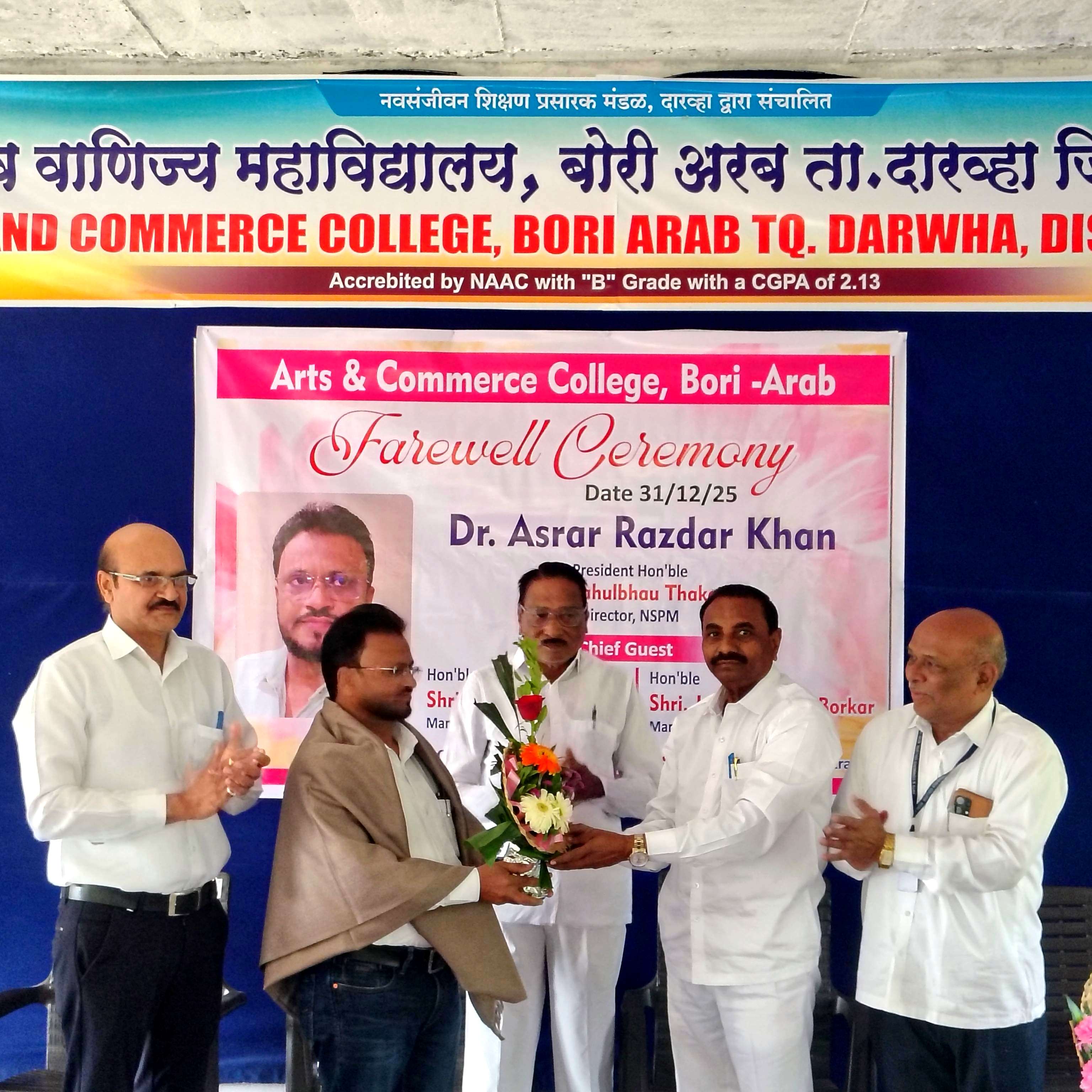 Read Moreदिनांक 31 डिसेंबर 2025 रोजी महाविद्यालयाचे इंग्रजी विभाग प्रमुख डॉ असरार खान यांचा सेवानिवृत्ती निमित्त सेवापूर्ती सोहळ्याच्या आयोजन करण्यात आले होते. यावेळी मंचावर संस्थेचे व्यवस्थापक श्री अशोकराव ठाकरे, महाविद्यालयाचे व्यवस्थापक श्री जगन्नाथ राव बोरकर व महाविद्यालयाचे प्राचार्य डॉ. दिलीप खुपसे सर उपस्थित होते. यावेळी प्राचार्य व उपस्थित पाहुण्याच्या हस्ते डॉ खान सर यांचा सत्कार करण्यात आला. त्यानंतर सर्व प्राध्यापक गण व पाहुण्यांनी खान सर यांच्या संदर्भातील आठवणी सांगितल्या. कार्यक्रमाचे संचालन प्रा. प्रकाश तेलगोटे यांनी तर आभार डॉ. नंदकुमार भाकरे यांनी मानले. यावेळी सर्व कर्मचारी यांच्याकडून डॉ खान सर यांना आठवण म्हणून भेटवस्तू प्रदान करण्यात आली.